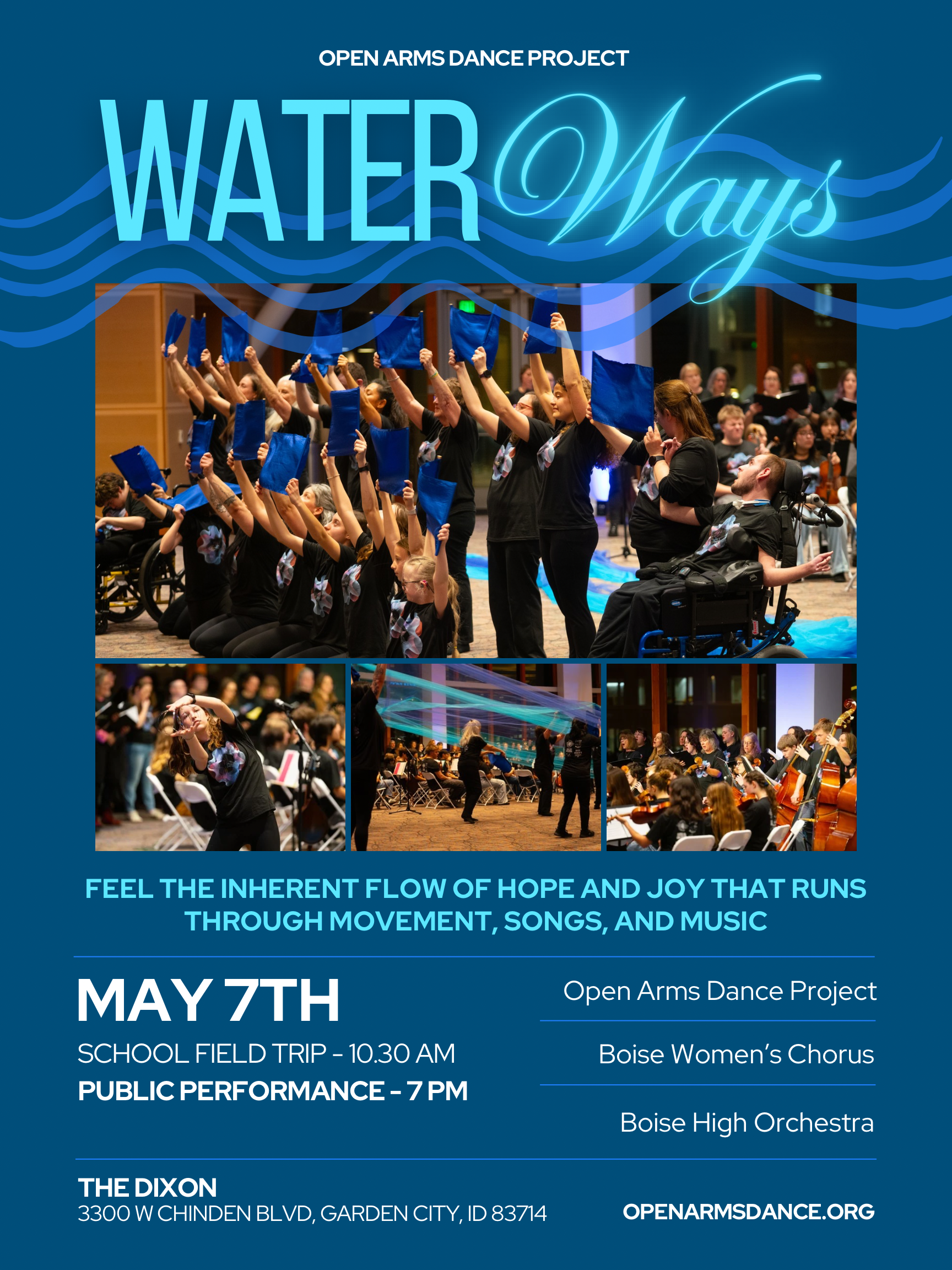 WATERWAYS includes collaborations with Boise Women’s Chorus and Boise High School Orchestra, as well as live video projection, audio description & ASL interpretation. All this flows together with the joyful, compassion evoking movement of our intergenerational and inclusive dance company.